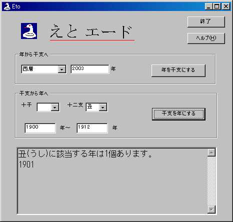 たとえば、20世紀最初の丑年を知りたい場合は、下の画像のように十干・十二支を設定し、年範囲に1900年から1912年を指定し、「干支を年にする」ボタンを押します。